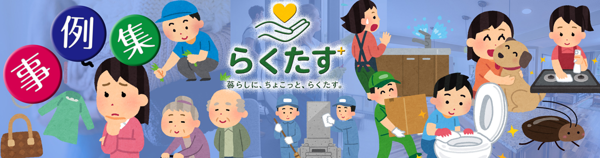 害虫駆除・お墓の掃除・お墓参り代行・ペットの世話・買い物代行・留守番・電話番代行・外出付き添い・席取り・順番取り・ペットお世話など・チラシ、ティッシュ配り・話相手・葬儀参列代行・掃除・整頓・キッチン廻り清掃・換気扇・レンジ清掃・浴室・トイレ清掃・サッシ・窓掃除・フローリング床・絨毯・カーペット清掃・ベランダ・玄関掃除・水廻りの詰まり掃除・キッチン、お風呂、雨どいなどの配水管掃除や水漏れパッキン交換・水廻り機器取り付け・取り外し/浄水器・食洗機・ウォシュレット・洗濯機や乾燥機・生活機器の取り付け・取り外し/照明器具・Wifi機器・見守り機器・エアコン掃除・取り付け・取り外し・営繕・ちょいリフォーム/網戸・障子・ふすま。クロス張替え・屋根や外壁の修繕・雨漏りや防水対策 その他